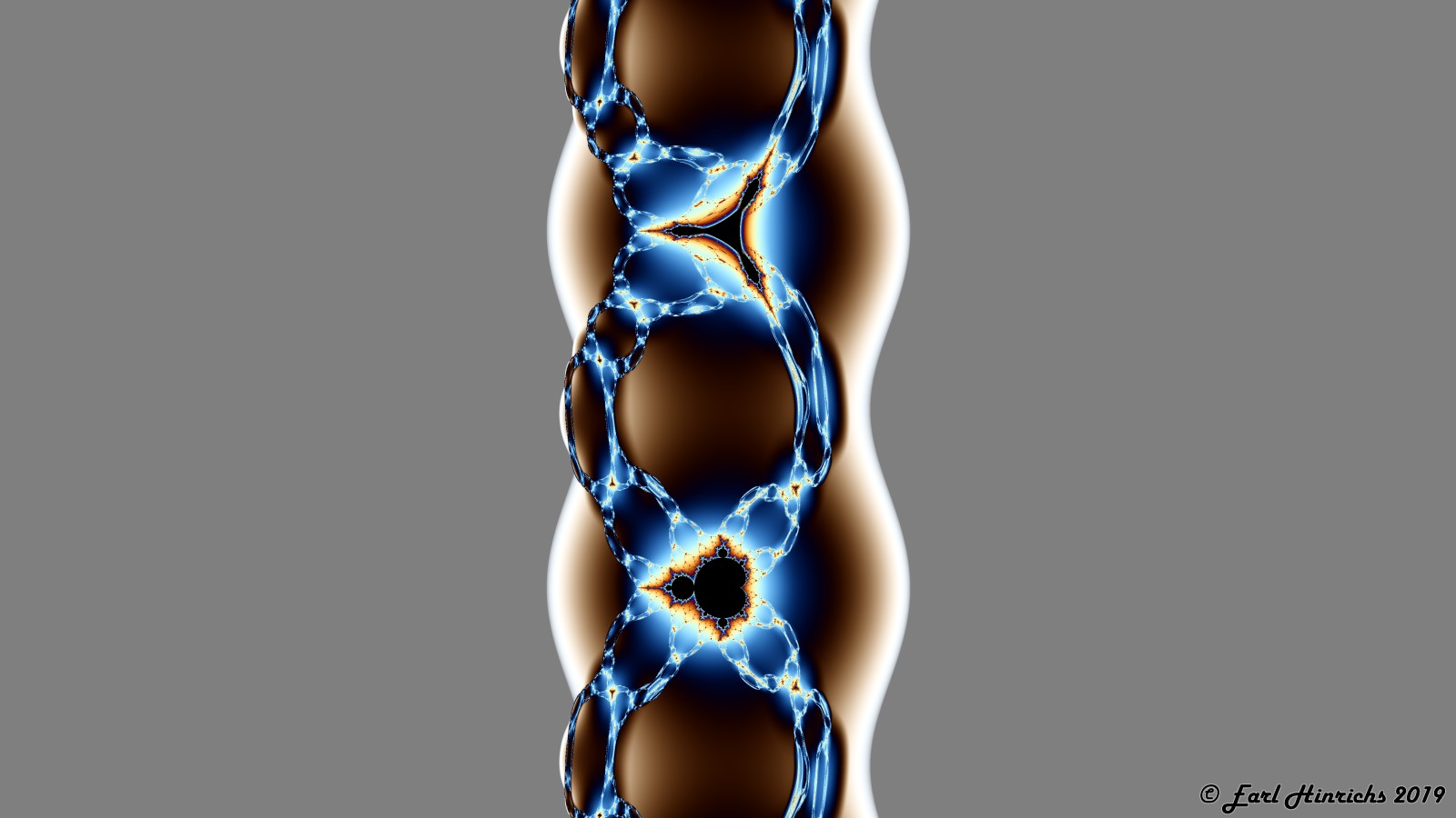 Here is a zoom out by a factor of two from yesterday's picture. The triangular shape at the top is called a Tricorn or Mandelbar. The parameter a is 2.5. (See Bugs #8 for a description of the formula.) The image is centered at $ (a * \pi /2) * i$.