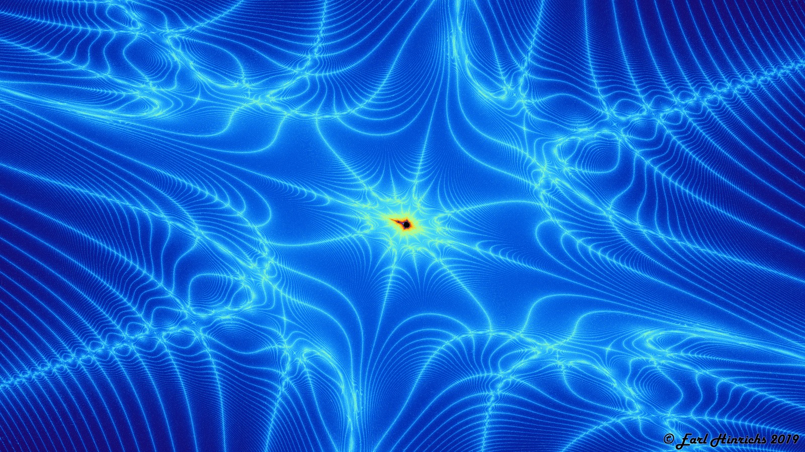 Yesterday's image was a deep zoom into a "quiet" area. It appears that an infinite grid with ever finer lines is everywhere. At every intersection, a deep zoom holds something interesting. Here is a distorted minibrot.