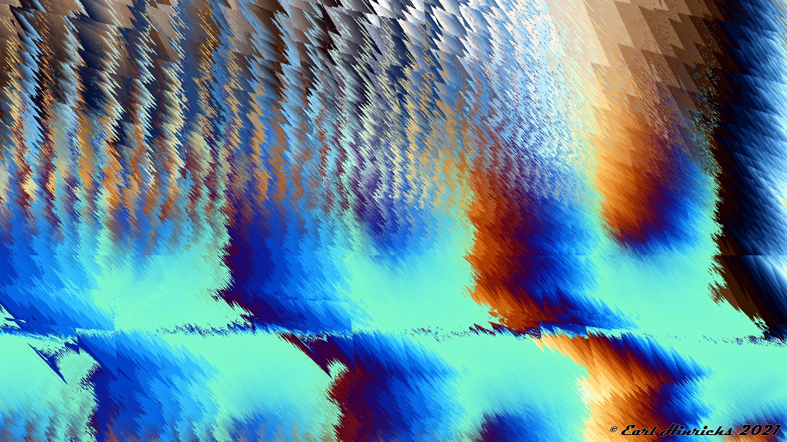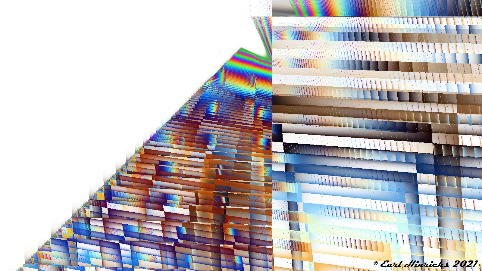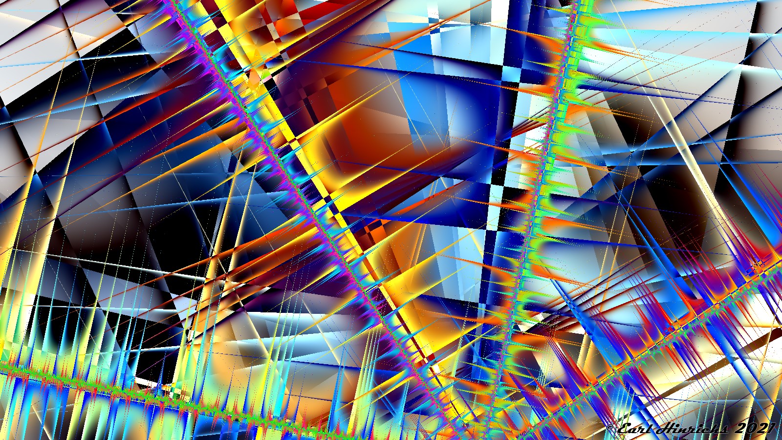 The other pictures in the sequence fractal series had a non-linear component. Somewhere in the generating formula there was "za" with a != 1, usually a=2. Just for fun, I tried building some pictures without exponents in the formula. The results were interesting and I included those two in the introduction. But I never got back to the purely linear variety in the rest of that series.