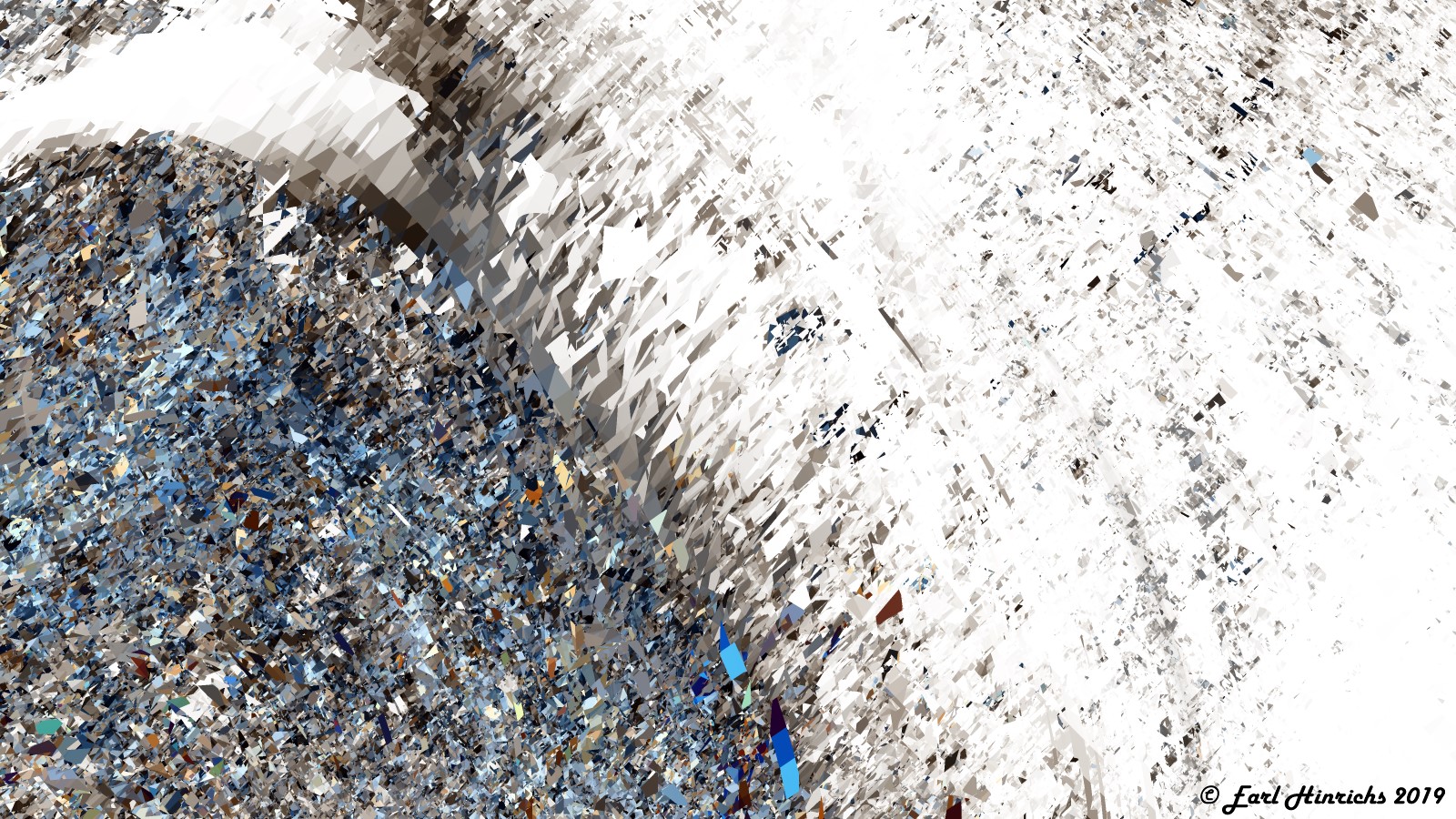 The Confetti algorithm and its variations are designed to transform an otherwise clean and simple image into something messy and chaotic. I mentioned in Confetti #10 that as I was trying different variations the results were too messy. Imagine the lower left here being the entire image. I switched to an almost all white palette, leaving just enough "dirt" to keep it interesting. It provides a nice contrast to the denser mess on the left.