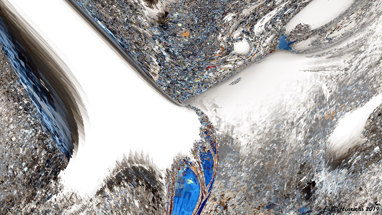 When I completed this one Confetti #24, the detail in the diagonal boundary separating the top left corner is very close to the flow idea. So a little exploratory side trip seemed justified. The low iteration fractal stretches and distorts the confetti squares, turning them into little rivulets. It is a delicate balance. Too few iterations and they are still rectangles, and in some cases parabolic sections. Too many iterations and they turn into fractals.