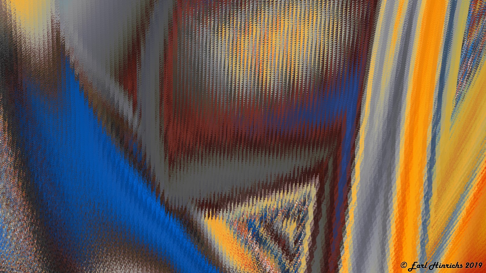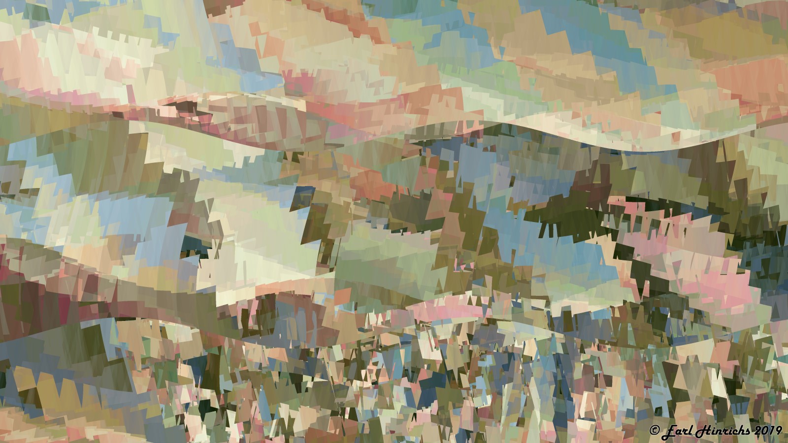 Here is another one similar to something on my todo list. "curved line cubism". This one has a vague cubist feel. There are lines that run through the image. There are similar colors on each side, but no continuity across the them. The lines are curved, suggesting a flow, but not the usual straight lines, squares, circles you would expect in a cubist painting.