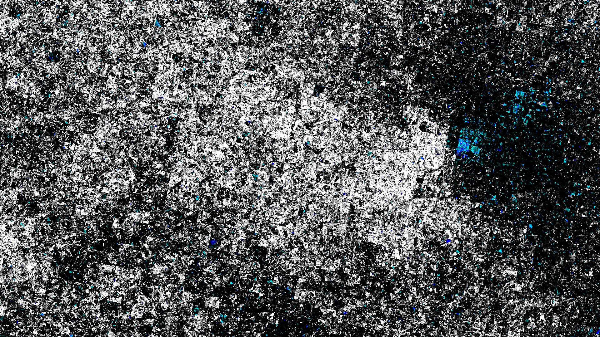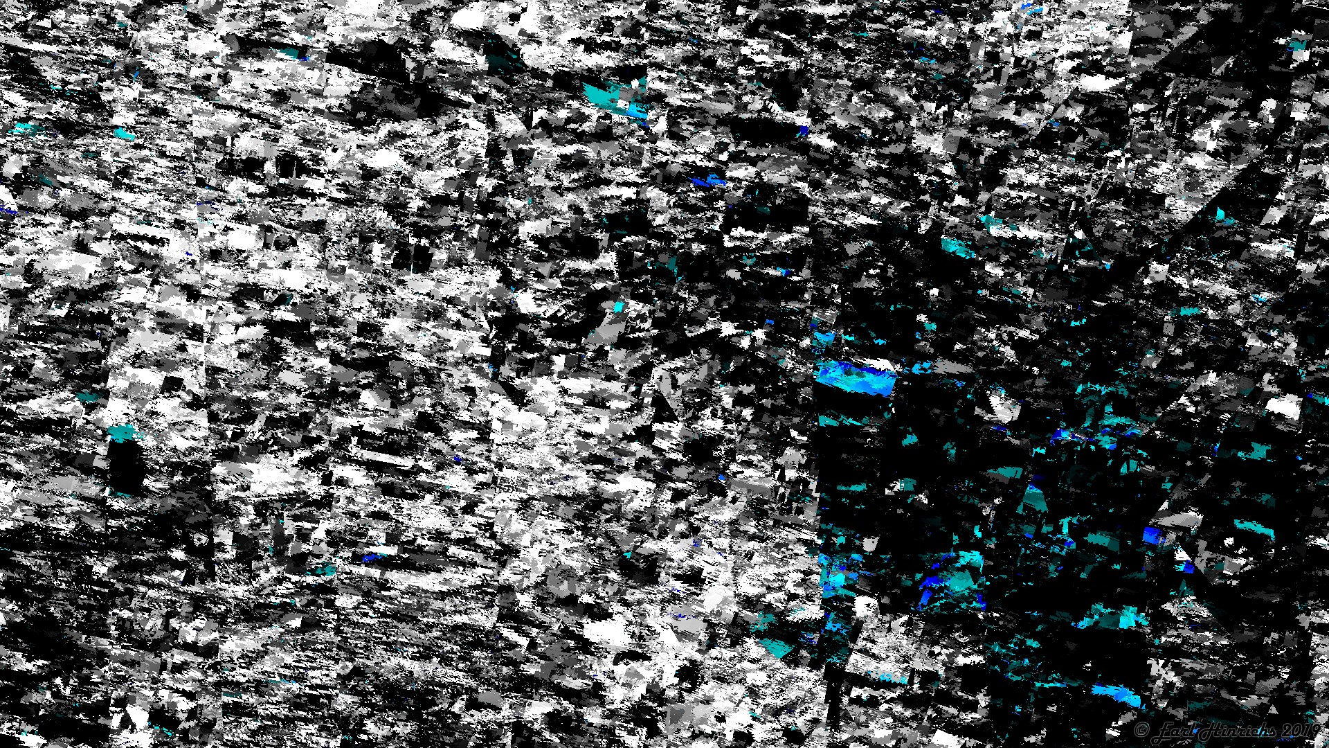 This image is generated by an algorithm that I wrote. The original idea was to start with a simple minimalist geometric abstraction, in this case white and black with a small splotch of blue and cyan, with smooth color transitions. Then chop the image up into small squares, displace the squares by varying amounts and then repeat until the original was suitably mixed up. When I implemented this algorithm in a straight forward manner, as suggested by the description, I was disappointed in the results. It was not want I expected, and not in a serendipitous way.