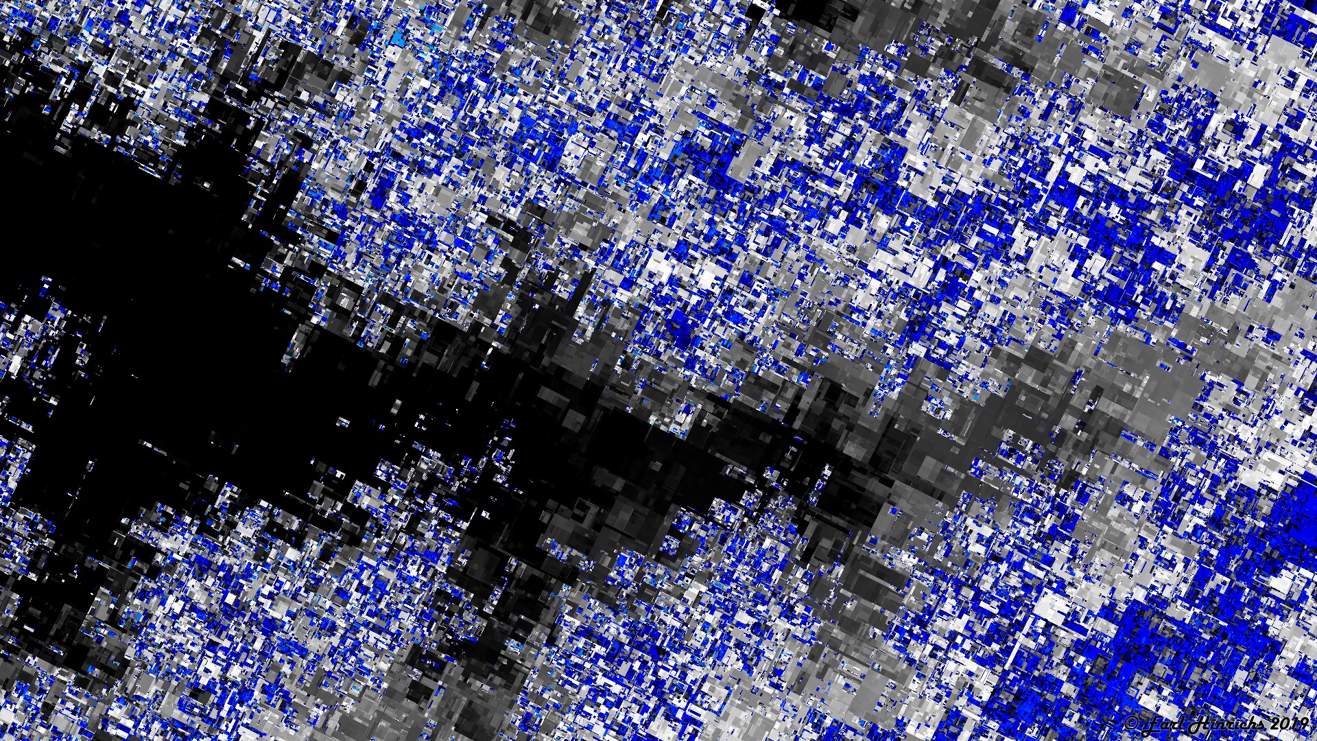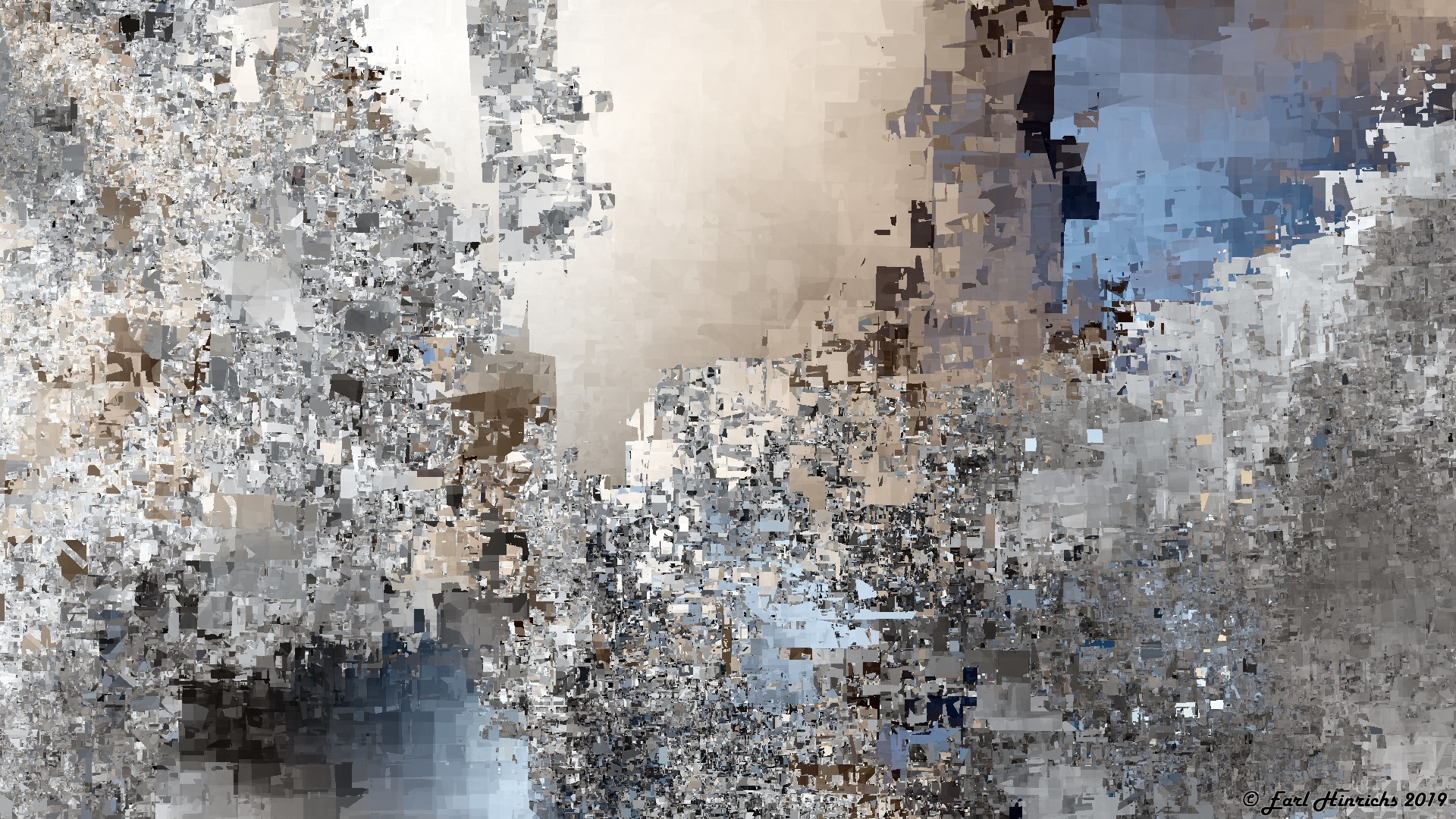 In today's image, different "entropy" levels are assigned to different areas. Recall (yesterday's post Confetti #2,) the algorithm generates different distorted squares, which are used to shuffle around the colors in the starting image. The algorithm has parameters that control the size of the distortion. Rather than setting these parameters universally for the whole image. Another "set up" function sets them differently for different areas of the image.