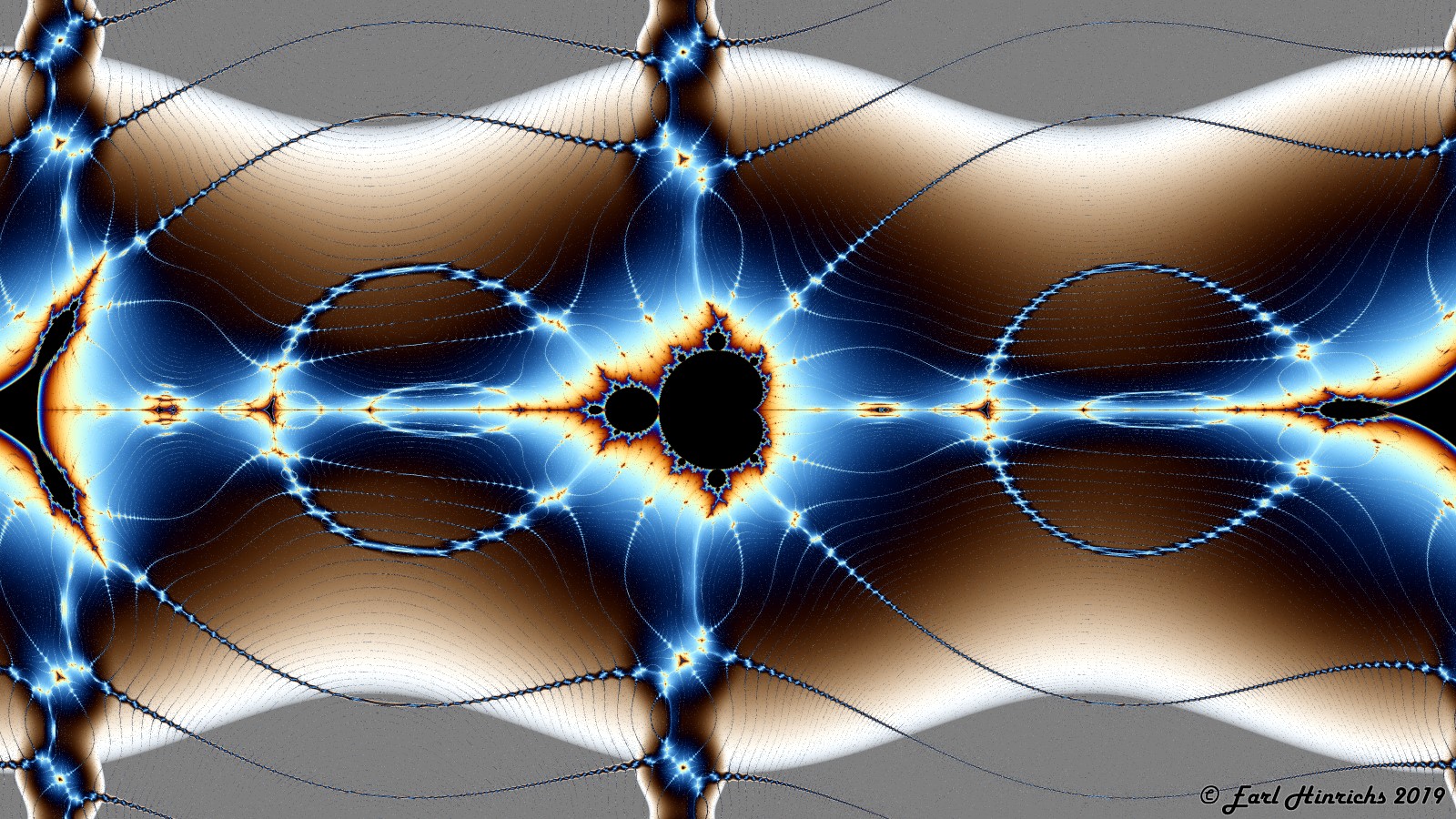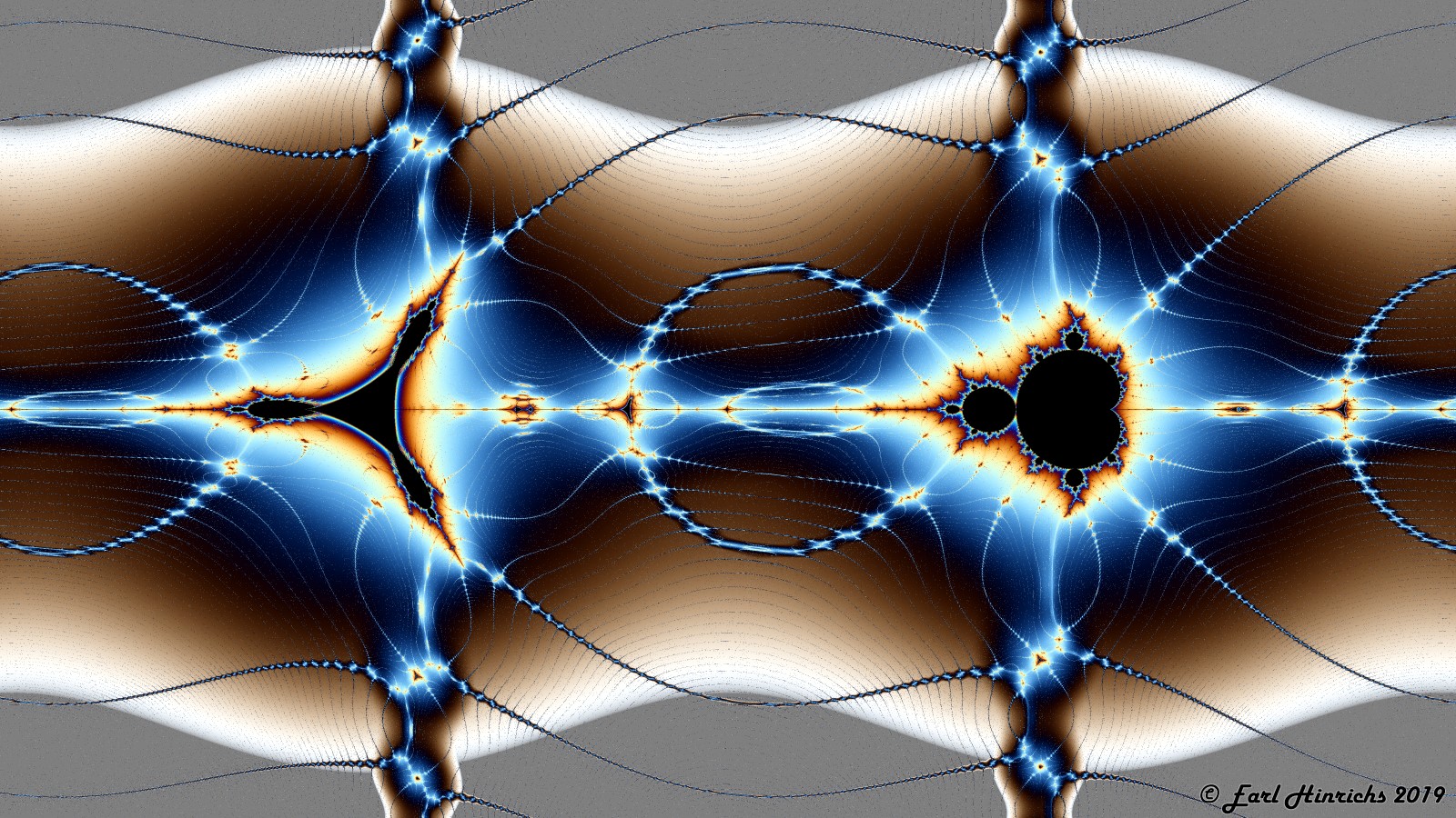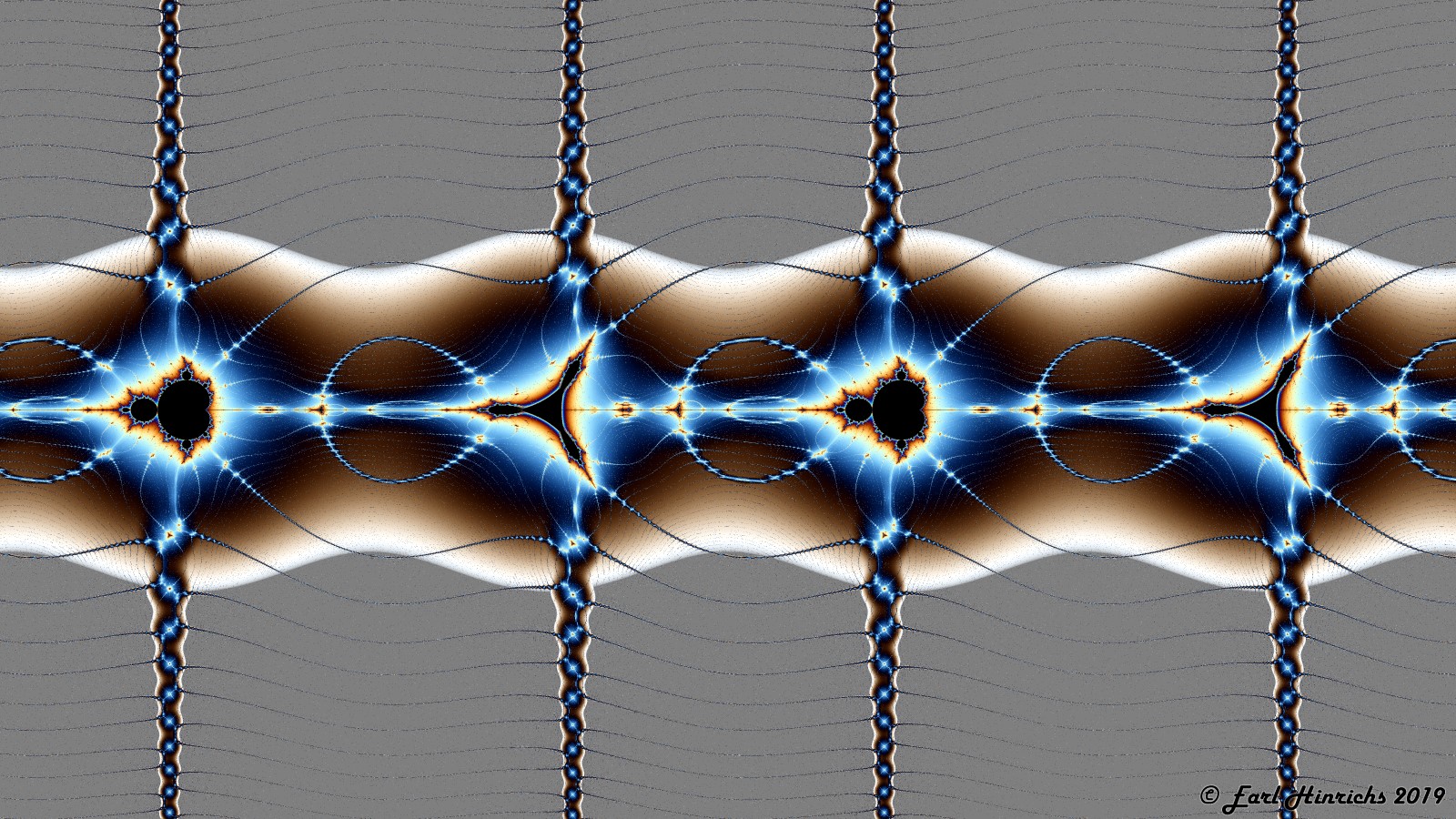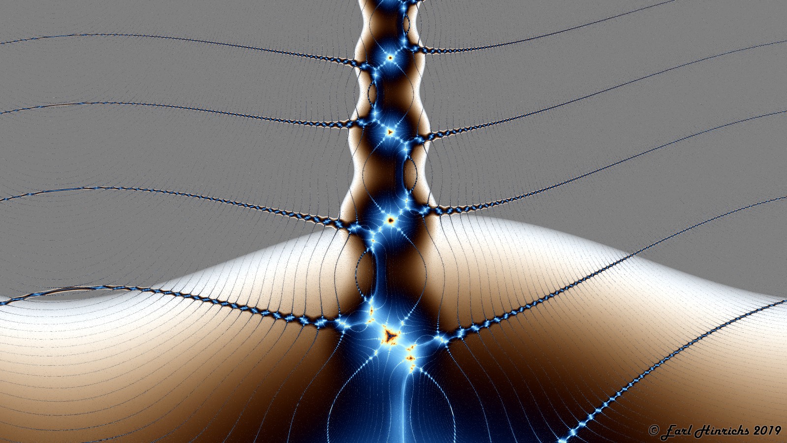 Here is a look at the vertical spoke rising above the origin. Msets and Tricorns alternate here as well. The picture back in Bugs #18 show a mini-tricorn. The text describes an infinite grid of points covering the whole plane where the iteration of 0 falls into a 2-cycle. The hot spots in this picture are some of the points on that grid.