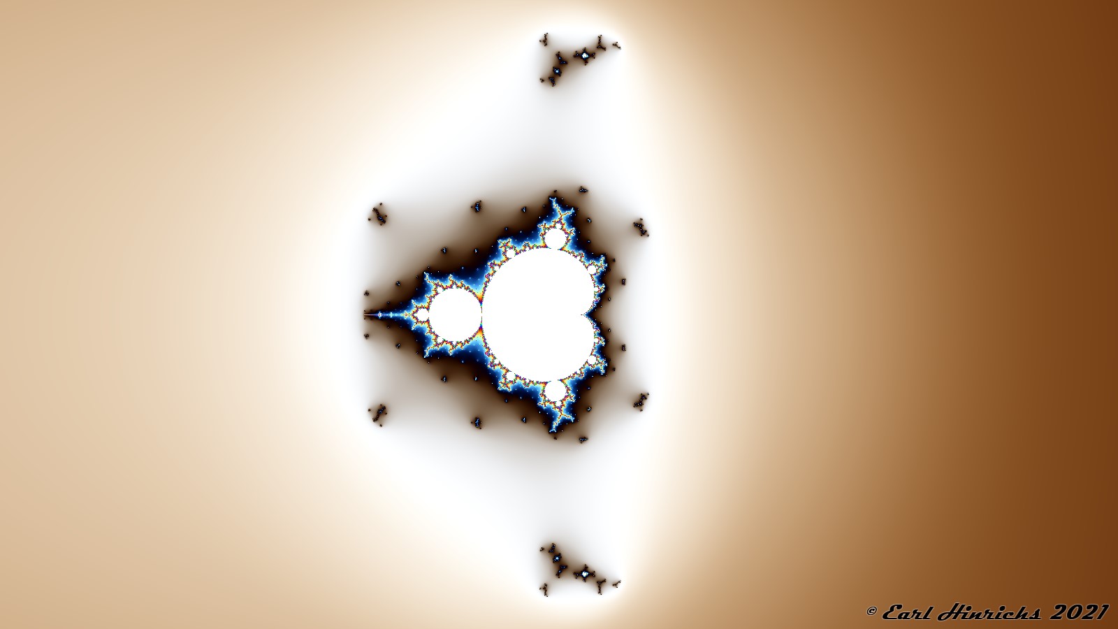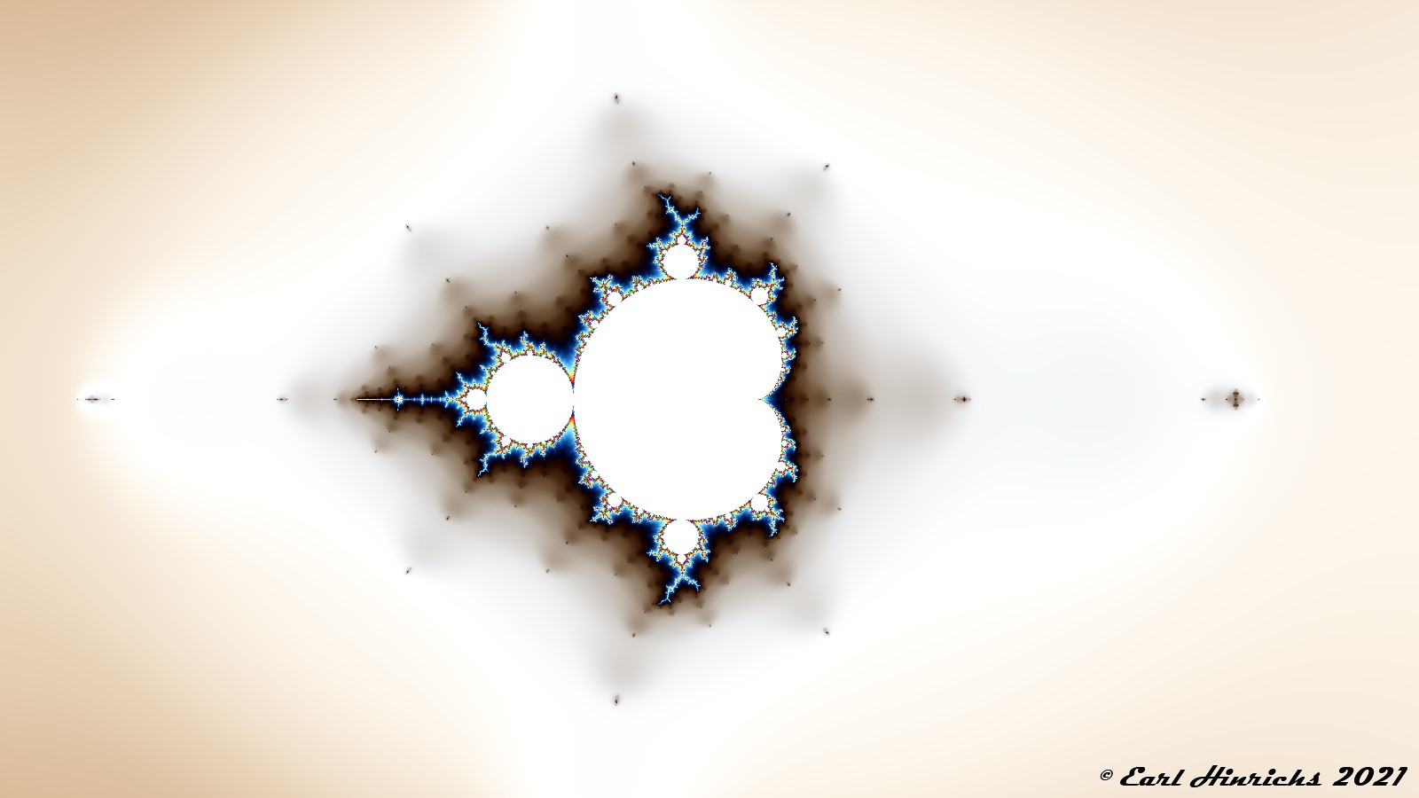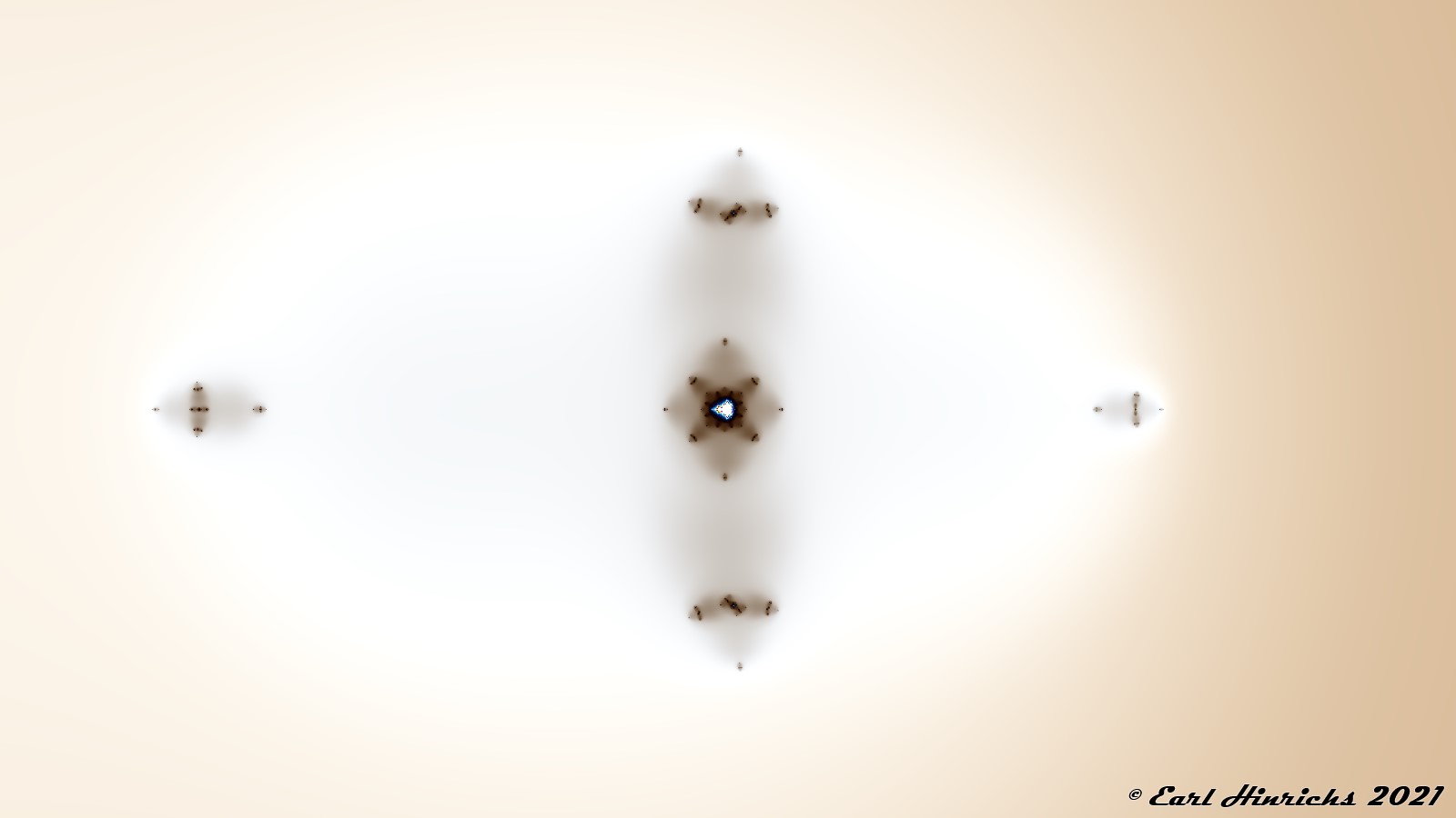 Go back to the picture that kicked off this series, Sequence Fractals Part I #1, and notice the small speck on the far left. Today we zoom into that area. At the center is the two-cycle visited in Sequence Fractals Part I #4. At the far left of this image is a three-cycle, and the subject of tomorrow's post.