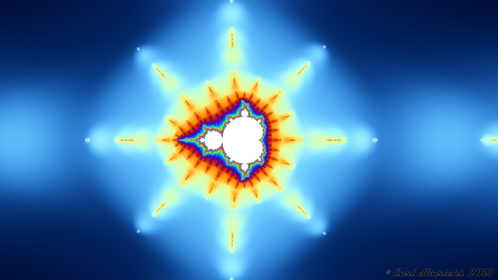 If you look back at Sequence Fractals Part I #1, you will see there is something in the middle, near c=-2, that was cut off from the zooms to the right Sequence Fractals Part I #2 and left Sequence Fractals Part I #3. Here is a zoom of that thing in the middle. I am not sure whether this is a part of the feature as c=-3 or c=0, or if it is something by itself. I am not sure how to define "part of". I think I will call this a part of c = -3. Notice the satellites are nicely placed at 90 and 45 degrees.