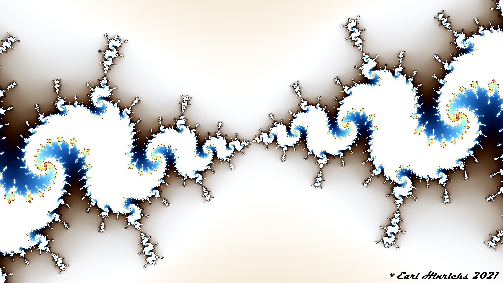 Here is the view from the other critical point of the same area, same zoom and colors. The Mandelbrot surface is complete. Except for the chunks knocked loose in the previous picture Sequence Fractals Part II #15, the white areas are the same.