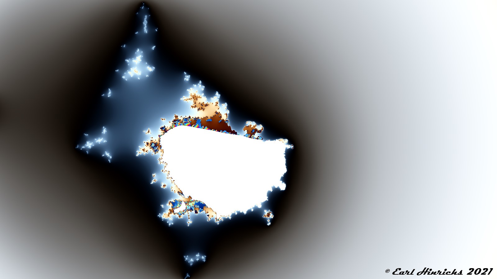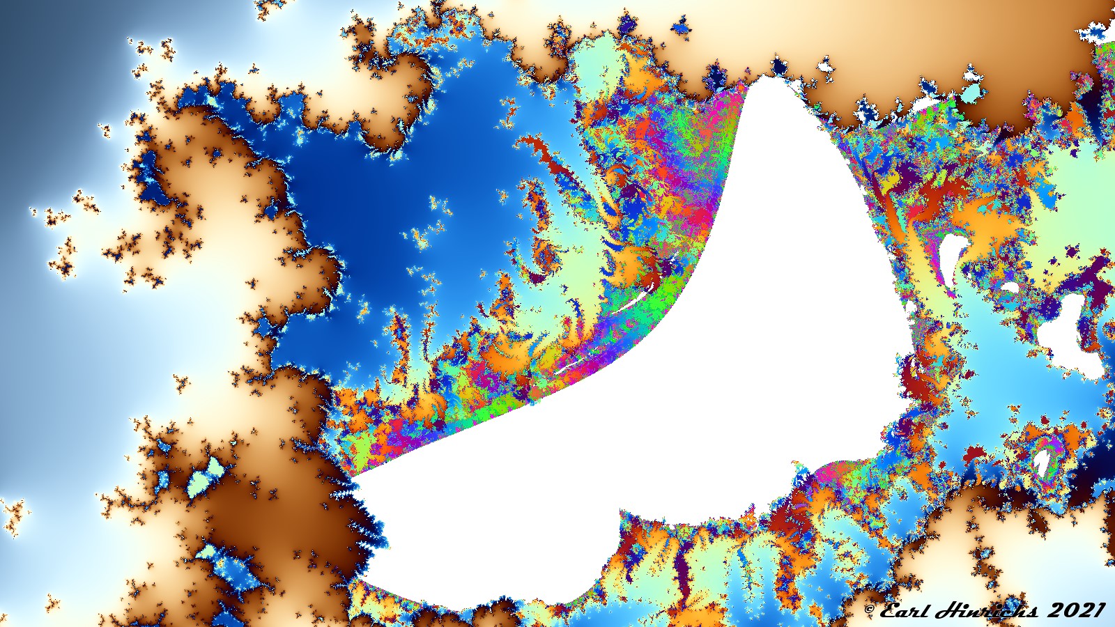 But, since some points are captured and some escape, there is a boundary between those two sets where interesting things happen. Typically, each iteration step removes a thin layer around the capture set, revealing a little more detail. There is a smooth color transition. That is happening here. In addition, the sequence gives the orbit an extra kick. That causes larger chunks to be kicked out to the escape set. You can see this in areas that look almost like a puzzle. Interconnecting pieces of distinctly different colors.