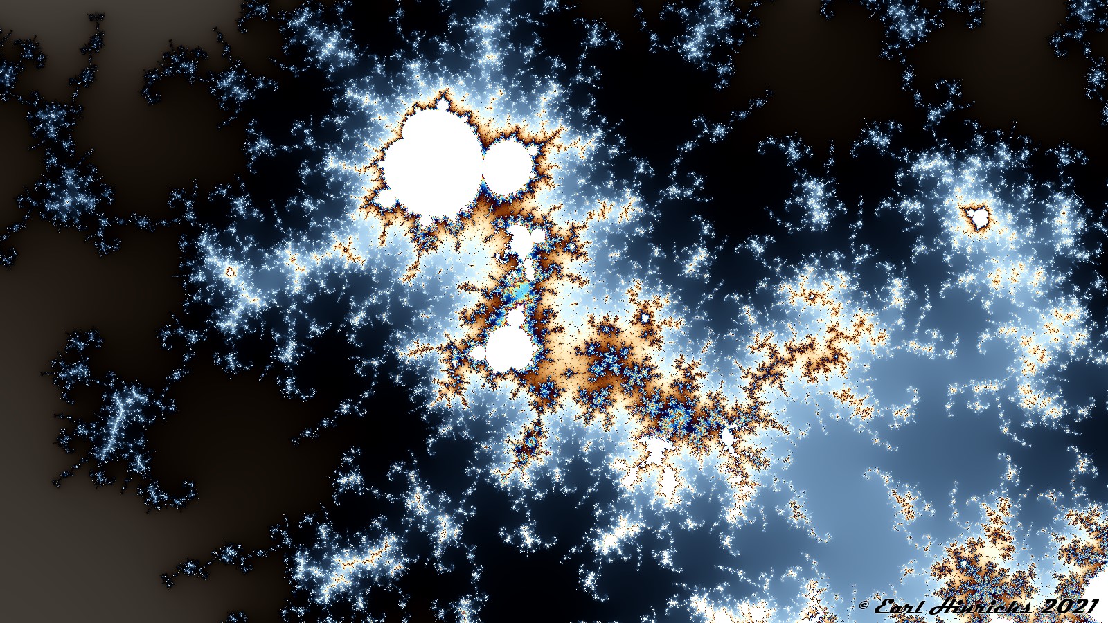 A zoom near the center of yesterday's image, Sequence Fractals Part IV #3 where the tips of the two 'brots collide.