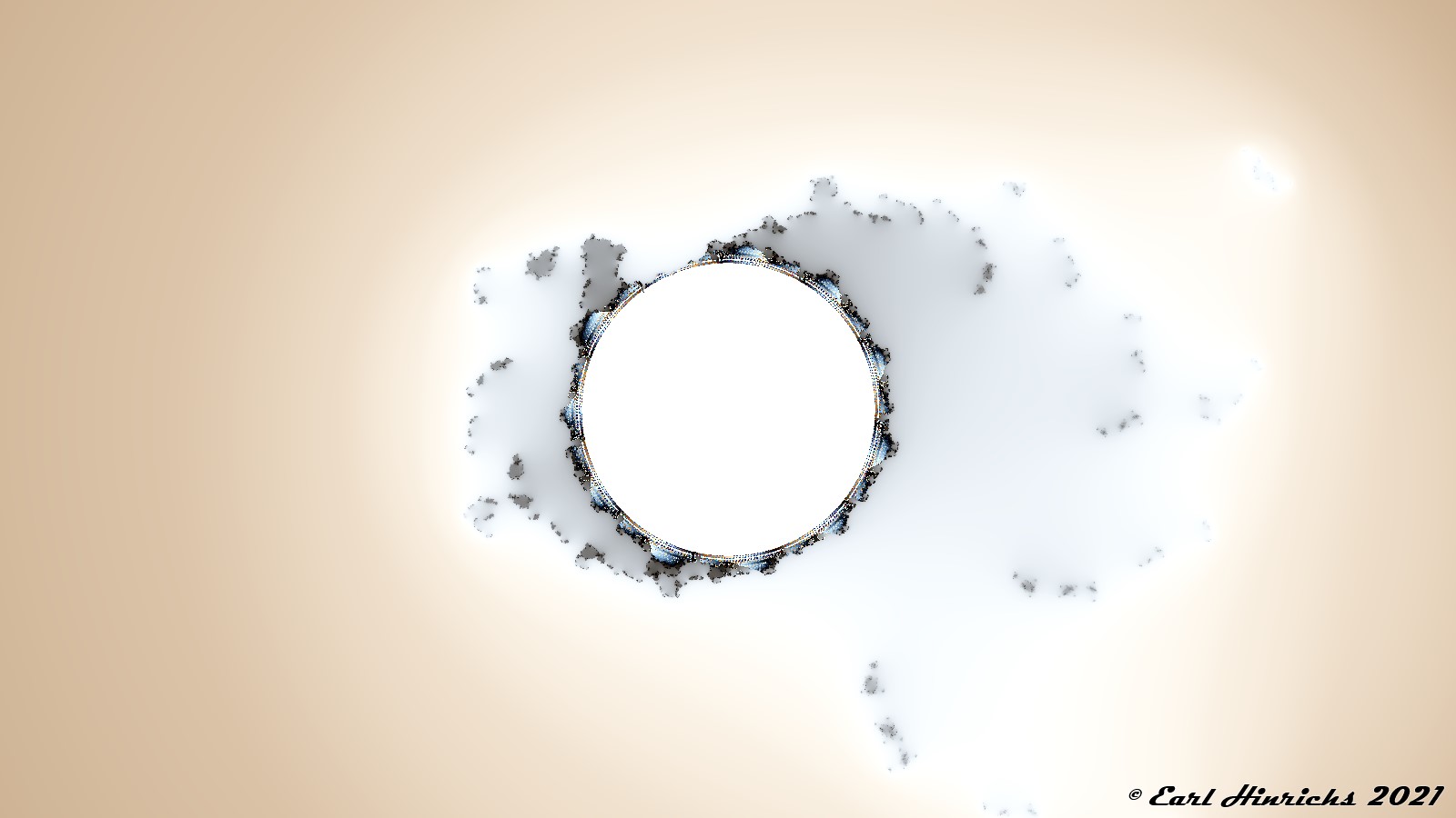 Note: Yesterday's picture is a bit misleading. There appears to be a white bridge (points in the capture set) between the two bodies. Upon increasing the iteration count, I discovered that the two bodies were not actually connected. Most of the points in this area escape, but they take a very long time before deciding to leave.