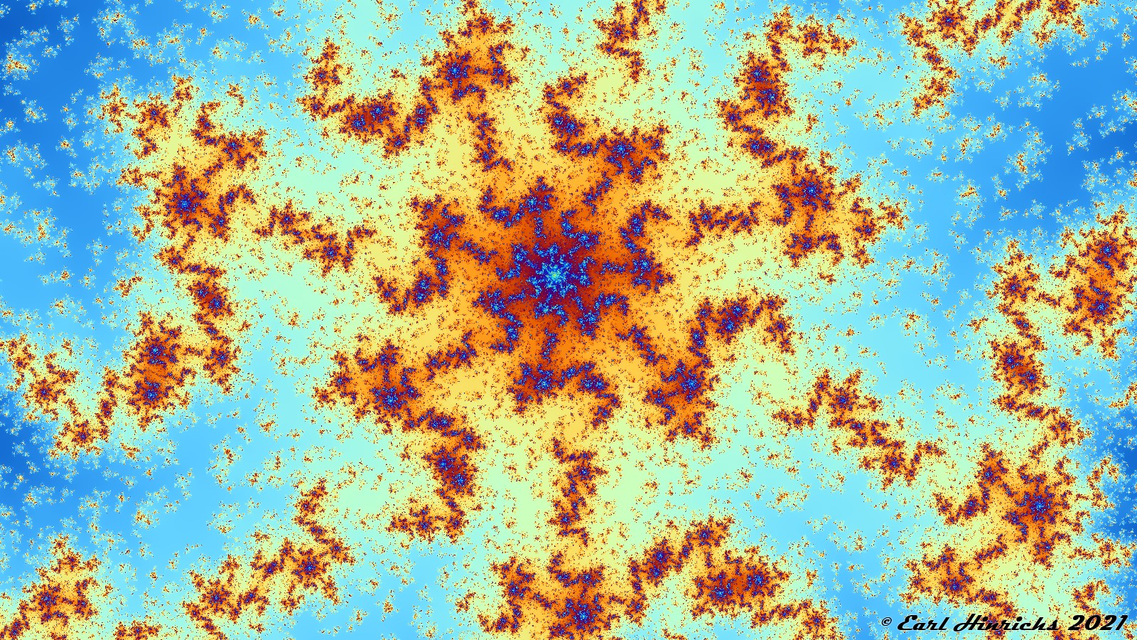 I feel compelled to try to describe this when I should just let the image speak for itself. This has some characteristic of the jigsaw puzzle fractals. See Sequence Fractals Part III #27 and Sequence Fractals Part IV #16 for a description of "jigsaw puzzle fractals". The areas that I image as the puzzle pieces have a fractal spirals along the edges. The "drop cloth" fractals, see Sequence Fractals Part IV #22 and Sequence Fractals Part IV #23 also have fractal shapes on the edges of puzzle pieces. This one however seems much more organized than the splashed paint appearance of the others.