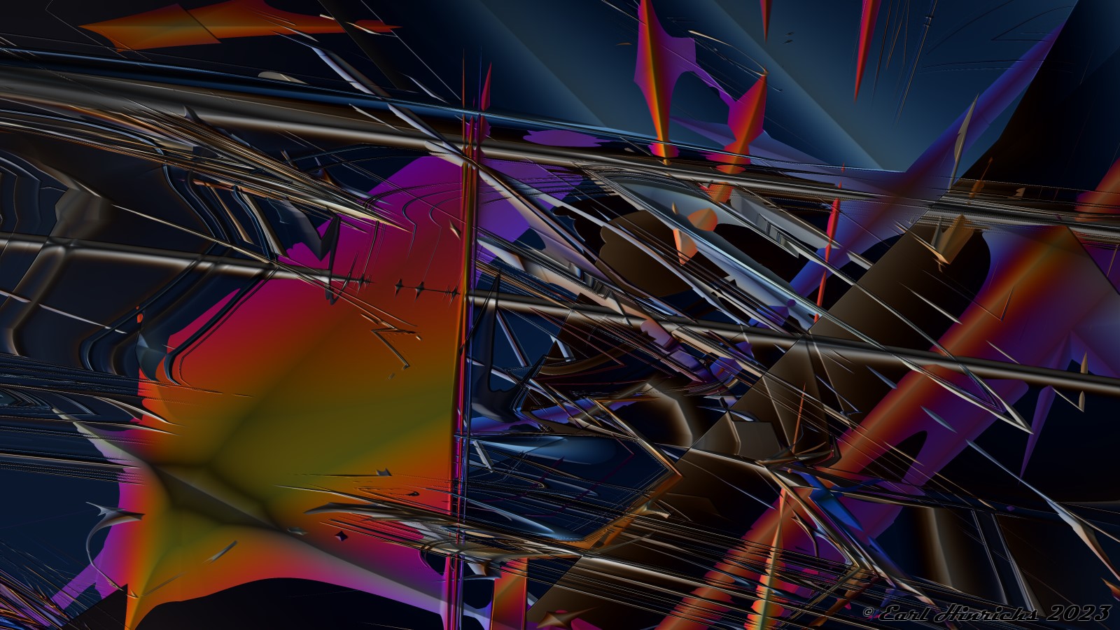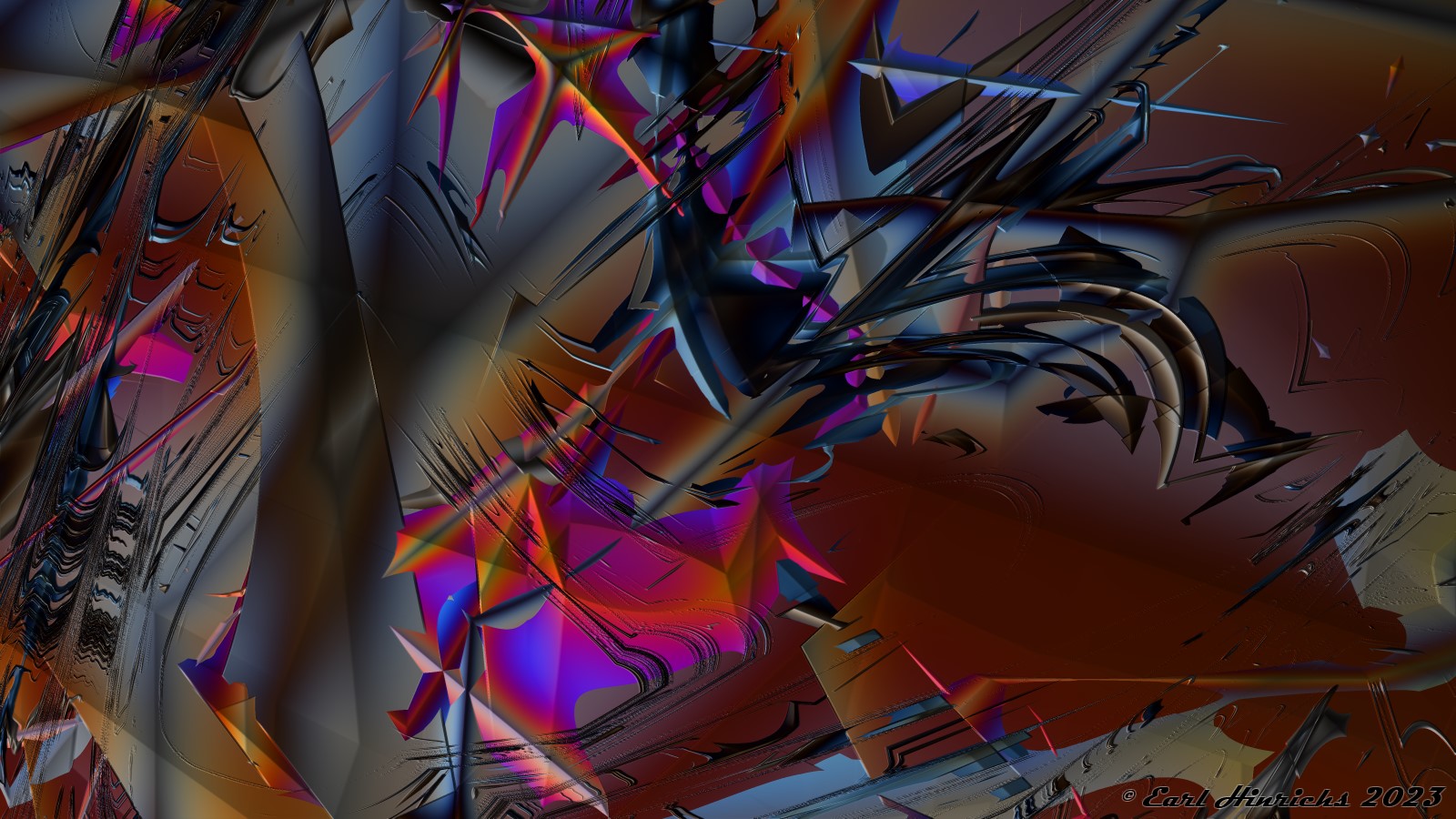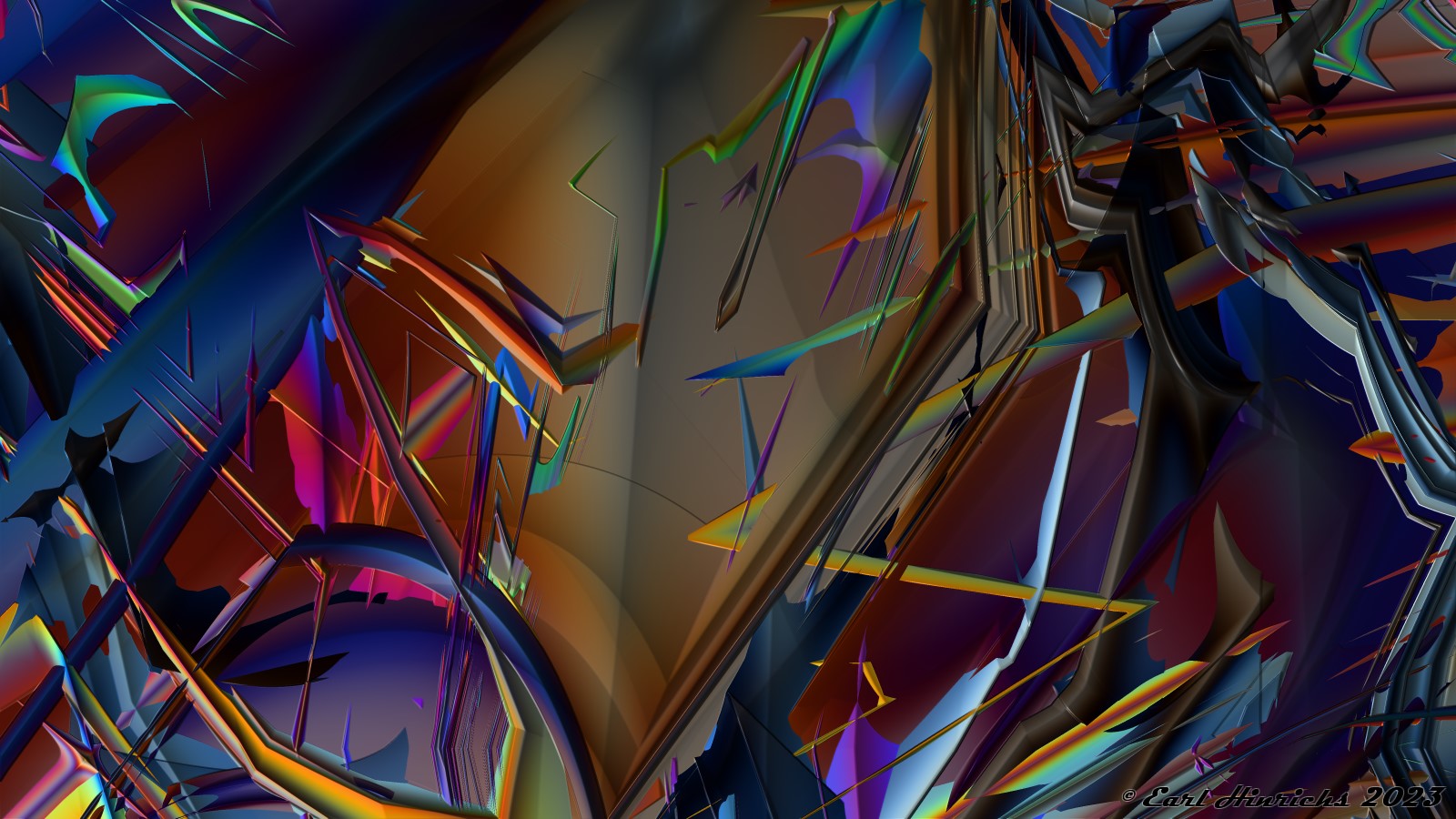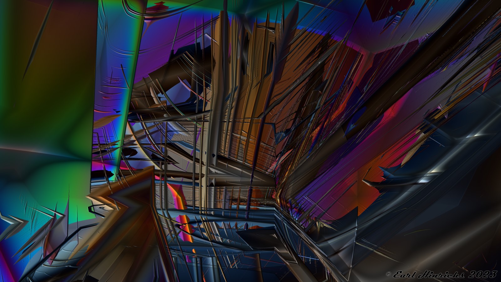 Strange Architecture is a continuation of The View Near the Vortex. The first few pieces here were originally a part of the previous series. I pulled them out because they did not have the feeling of something being sucked into a vortex. The colorful sharp pieces are present, but they seem static. Or if not static, it is as if there is some design or intent in the motion. Some kind of strange architecture.