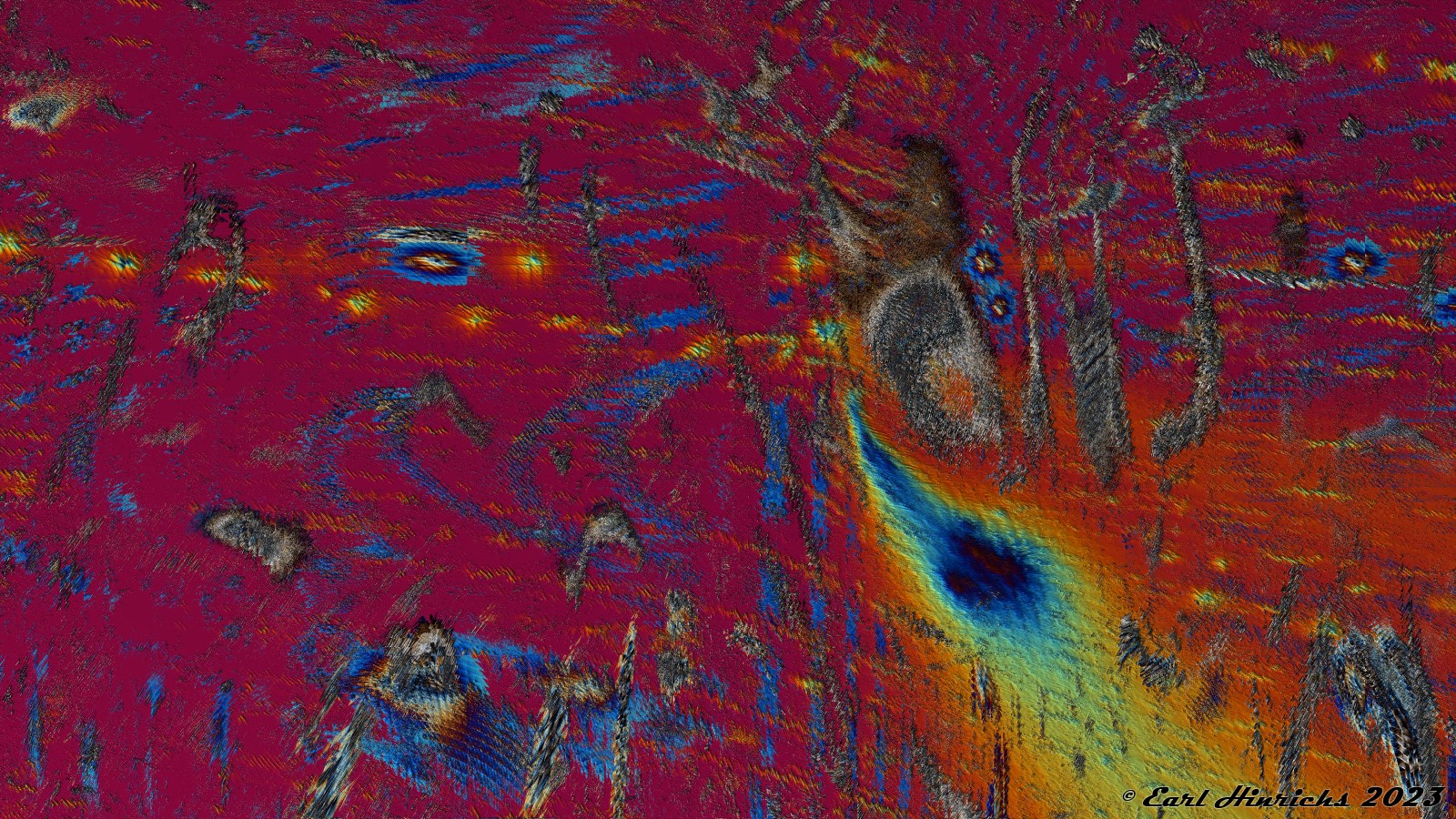This one is getting close to the right recipe. More colors, especially the addition of black and white distributes the viewer's focus. The storm centers suggest something interesting, but are too small make out the details. (Thus sidestepping my problem of providing the detail.)