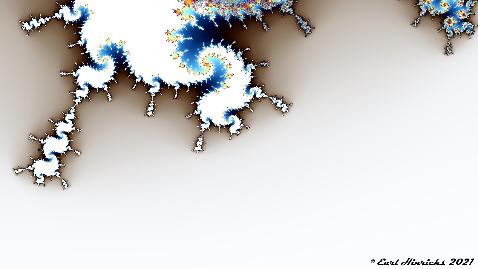 M1,1.03: 0.595284, -1.628989Whoa! What happened? The Misiurewicz point itself still escapes, but many of the nearby points are captured (white). Up until now, the M points all have baby Mandelbrot sets nearby which capture orbits. But they are small, and usually invisible without high magnification. Here, the white space is huge and looks nothing like the Mandelbot set.